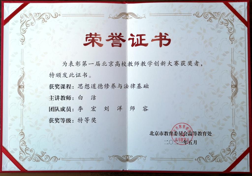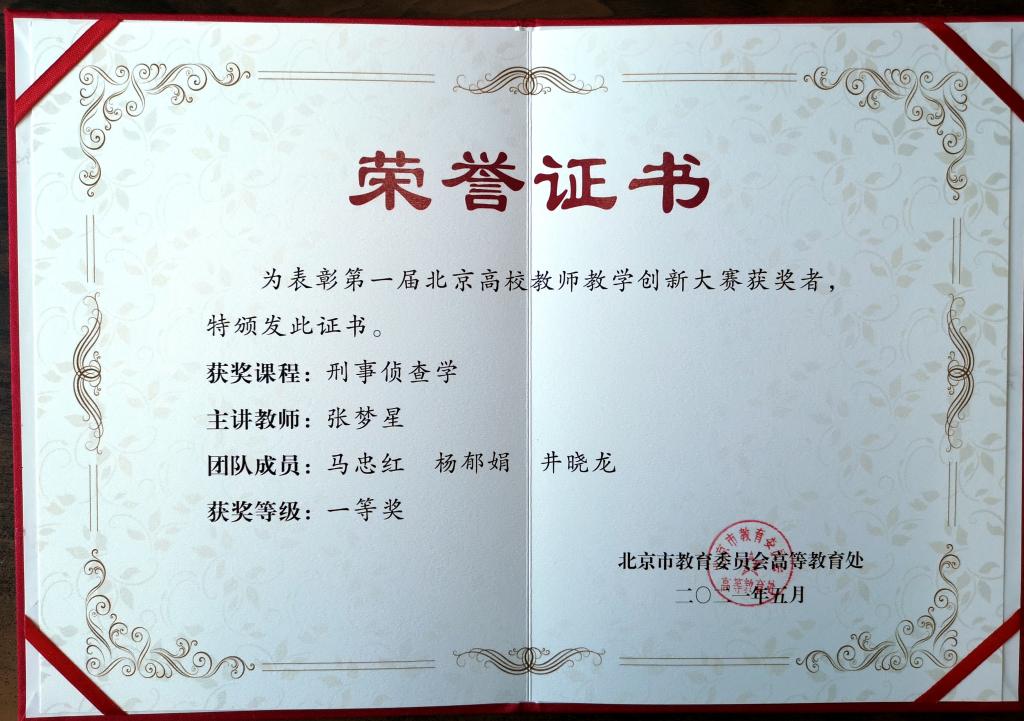 近日,“首届全国高校教师教学创新大赛”北京市地区比赛落幕,本次大赛北京市地区共有286支教学团队参赛,84支团队获奖(占参赛团队的29.37%),包括特等奖9项,一等奖17项,二等奖28项,三等奖30项)。我校马克思主义学院《思想道德修养与法律基础》(主讲教师:白洁,团队成员:李宏,刘洋,师容)教学团队荣获特等奖;侦查学院《刑事侦查学》(主讲教师:张梦星,团队成员:马忠红,杨郁娟,井晓龙)教学团队荣获一等奖。接下来白洁老师领衔的教学团队将代表北京市参加全国高校教师教学创新大赛。