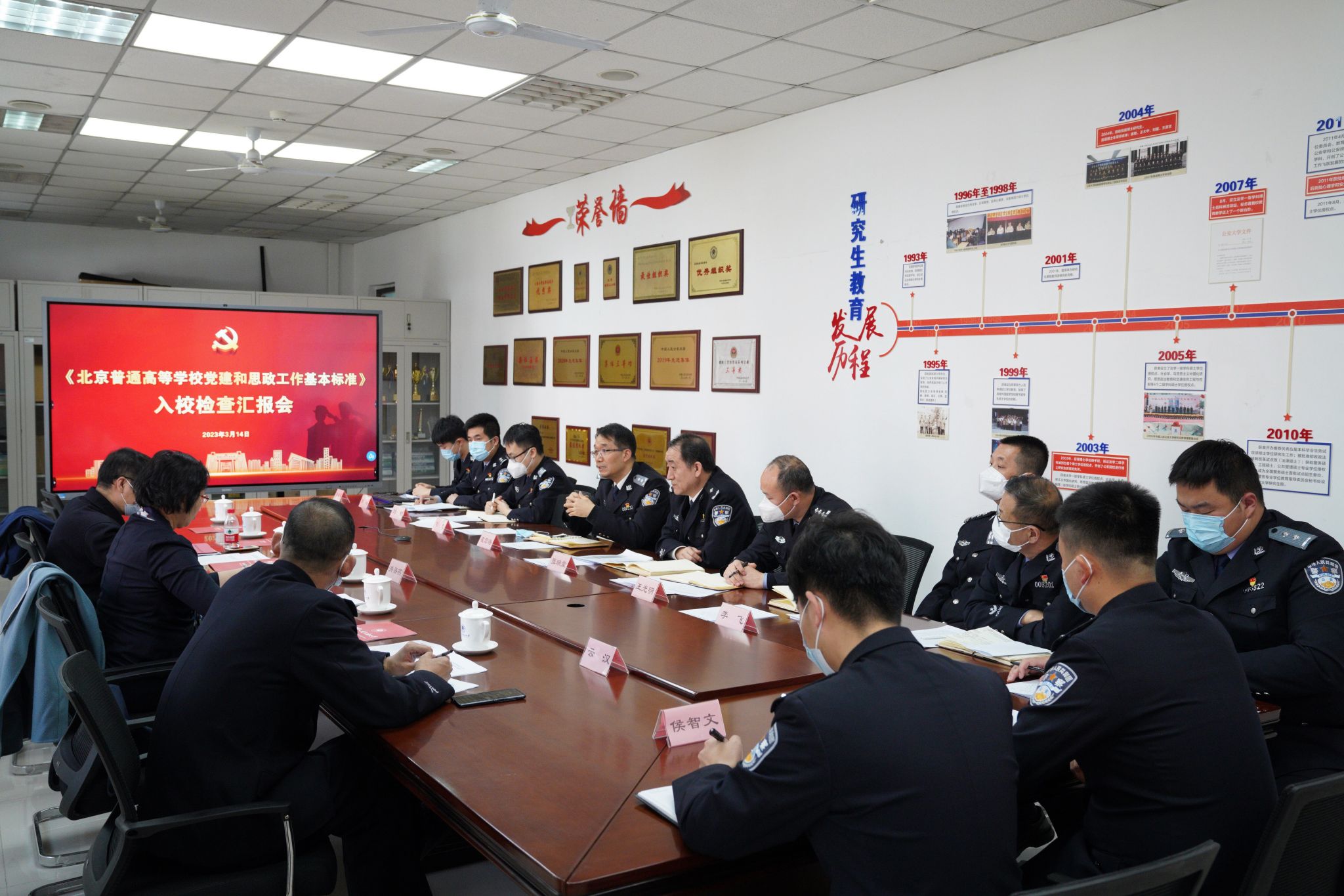 上午9时,入校检查汇报会在高警楼17层会议室举行。校党委书记陈定武代表学校党委作了《勇担公安院校“排头兵”使命重任,以高质量党建引领公安高等教育事业创新发展》的工作汇报,分别从强化思想理论武装、打好党的政治建设攻坚战、培养党和人民忠诚卫士、开展基层党组织“对标争先”建设、推动开放合作办学、深化全面从严管党治警治校、统筹安全和发展等7个方面,介绍了学校近年来党建和思想政治工作的丰硕成果、亮点特色和经验体会。他表示,公安大学因党而生、为党而兴,建校75年来,始终坚持政治建校、从严治校办学方针,秉持服务国家安全战略和公安事业发展的办学宗旨,履行立德树人、忠诚育警根本任务,为政法公安战线培养了30余万优秀人才,为平安中国建设和首都发展作出积极贡献。学校党组织关系转隶北京市委以来,市委市政府及有关部门对学校各项事业发展给予了有力指导和支持帮助。学校党委带领全校上下积极融入首都高等教育“大家庭”,充分发挥公安院校政治建校优势和行业办学特色,在首都高校打好党的政治建设攻坚战中立标杆、作表率。他强调,学校党委将持续深入学习宣传贯彻党的二十大精神和全国两会精神,认真贯彻落实中央政法工作会议、全国公安厅局长会议、北京市第十三次党代会、北京高校领导干部会议等部署,按照公安部党委、北京市委对学校提出的办学要求,认真对标《基本标准》,扎实抓好检查组反馈意见整改落实,持续推进以高质量党建引领高质量发展,努力为服务国家安全战略和公安工作现代化、服务更高水平平安中国、法治中国建设和北京“四个中心”功能建设作出新的更大贡献。校党委副书记、校长曹诗权围绕学校党委以党建统领推进“双一流”建设、服务国家安全战略、助力科技兴警、提升公安人才培养质量等方面情况作了补充汇报。