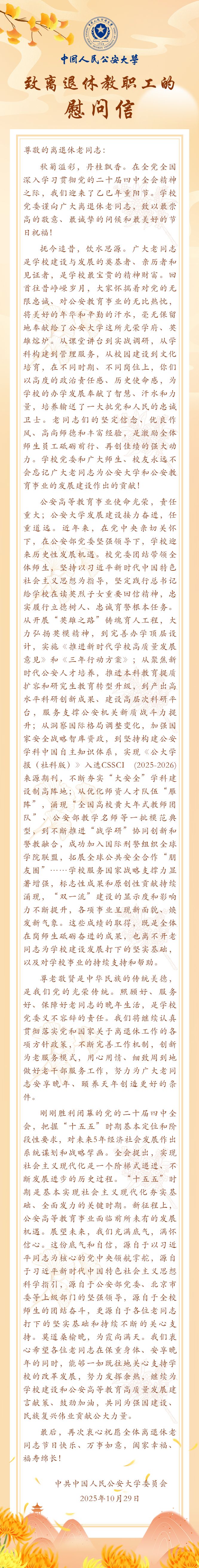 霜染秋林,菊香满径,岁岁重阳,今又重阳。当校园里秋阳照进书堂,银杏挂满金黄,我们总会不禁想起那些曾在这里挥洒青春、躬耕讲台的身影。曾几何时,你们在三尺杏坛春风化雨,用知识浇灌万千桃李;在科研一线潜心钻研攻坚克难,用学术垒筑学科基石;在校园建设里默默耕耘,用汗水勾勒发展蓝图……是你们用青春无悔灌筑了学校建设发展的坚强基石。那些伏案研读的深夜、躬耕讲台的晨曦、与学生促膝谈心的午后,早已雕刻成校园里最美丽的风景;你们的智慧、坚守与风范,是公大精神谱系中永不褪色的红色基因。