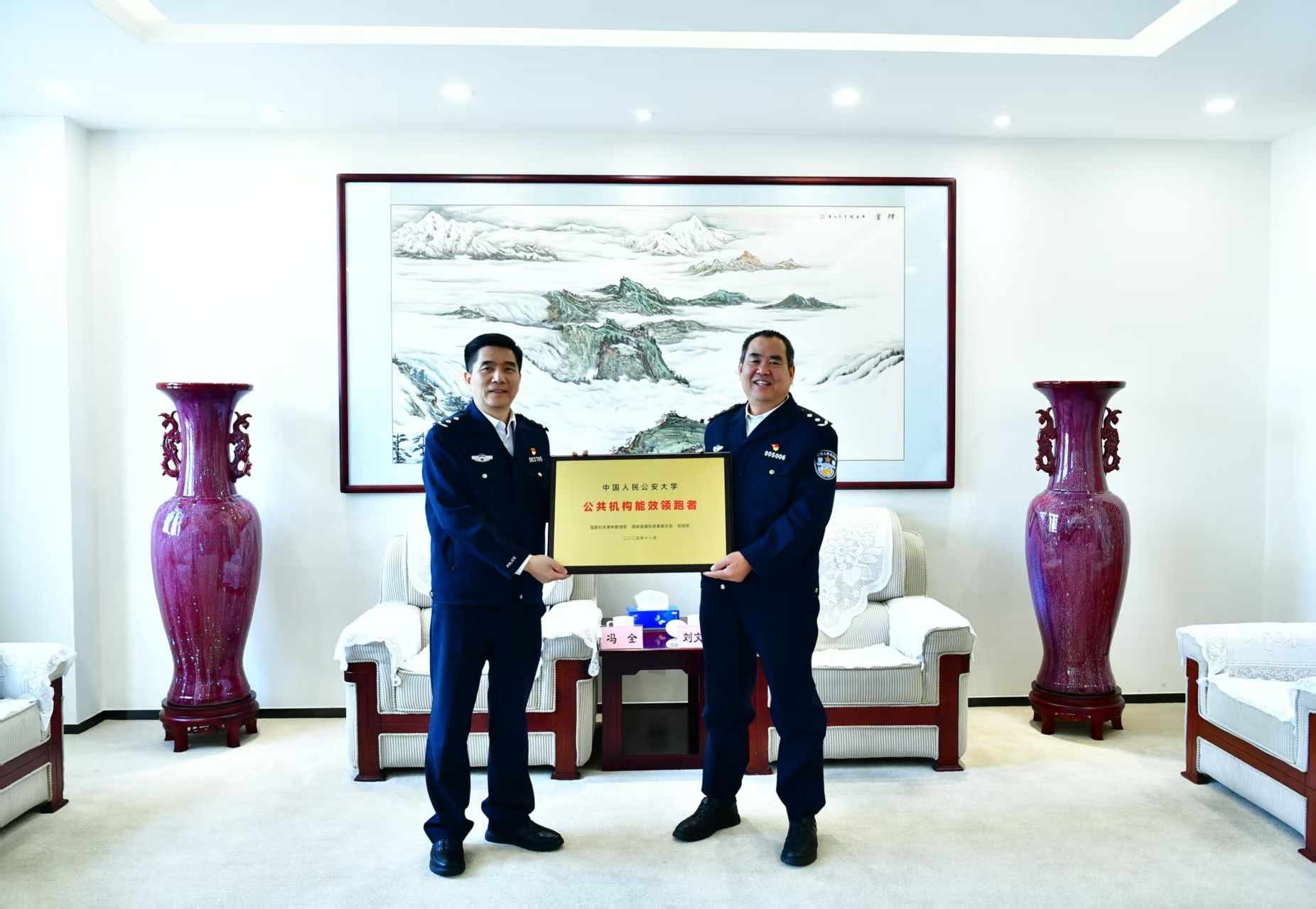 3月19日上午,公安部警务保障局冯全副局长率队到访我校,代表公安部节能办为学校颁发“公共机构能效领跑者”荣誉证书与奖牌。校党委委员、纪委书记刘文君出席活动,后勤管理处、基建处等单位负责同志参加活动。