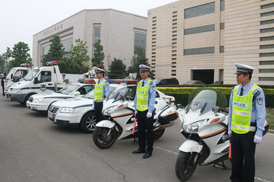 北京市公安局在校园内布置了交警、特警、网警等相关警种的装备展示,“最美交警”孟昆玉,“最美网警”高媛都在现场为考生和家长发放宣传材料,介绍各自警种特点和最新装备。