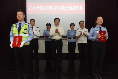 为在全社会广泛普及科学知识,弘扬科学精神,为全国创新创业人员、科技人员、科普传播、讲解和科普志愿人员搭建学习交流的平台,全国科技活动周组委会决定组织举办以“创新创业、科技惠民”为主题的“2015年全国科普讲解大赛”。2015年5月8日下午, “2015年全国科普讲解大赛公安系统预赛”在我校木樨地校区举行。校党委委员、副校长田全华,公安部科技信息化局巡视员刘明芳出席活动并为获奖选手颁奖。来自全国公安机关的40名选手报名参赛。根据比赛要求,从40名选手中选出24名选手参加预赛并通过预赛评选出6名优秀选手代表全国公安民警参加在广州举办的全国科普讲解大赛决赛。我校警务信息工程学院教师颜靖华以第二名的总成绩进入决赛,交通管理工程系教师马社强和刑事科学技术学院教师丁锰分别获得优秀奖。