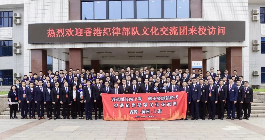 2018年8月26日下午,香港纪律部队文化交流团一行130余人来校访问交流。校长曹诗权、副校长席艳丽在高警楼会见了交流团全体成员并出席联谊活动。