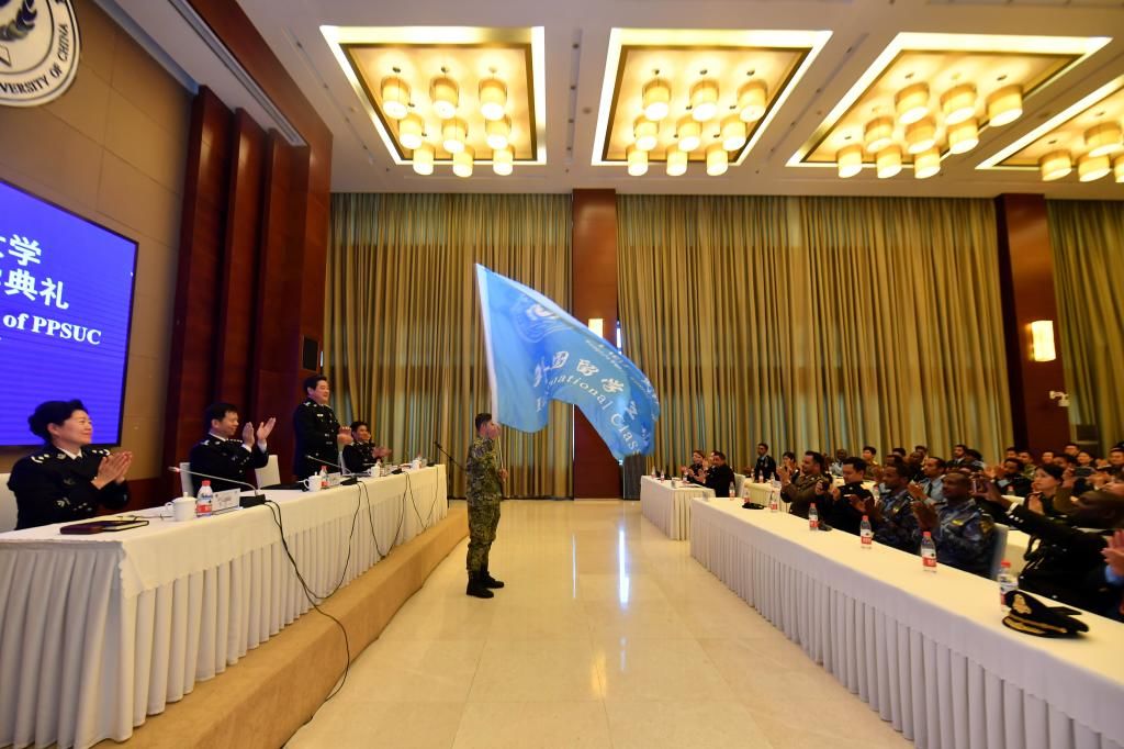 校党委副书记、校长曹诗权同志在典礼上为留学生班授旗,并在致辞中希望他们刻苦学习、增强本领,开放包容、加强交流,严明纪律、遵守法纪,努力成为具备全球执法胜任力的国际化警务人才。