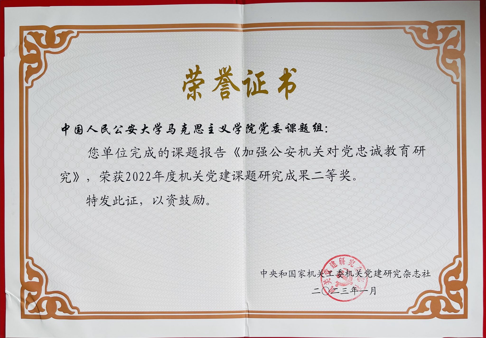 2022年3月,学院党委依托公安党建与思政学科,以马克思主义原理教研室党支部书记、公安党建学术带头人李青教授为组长,组建学科骨干教师侯潇潇、刘晓倩、刘东为成员的研究团队,申报《加强公安机关对党忠诚教育研究》课题,于2022年5月获准立项为重点课题。课题组经过为期7个月的深入调研,系统阐述了公安机关对党忠诚教育的重要性紧迫性,客观分析了公安机关对党忠诚教育存在的机遇和问题,创造性提出了加强公安机关对党忠诚教育的对策路径,形成了高质量、高水平的研究成果。该课题荣获中央和国家机关工委2022年度机关党建课题研究二等奖。近日,公安部直属机关党委印发通知,对该课题组予以表扬,并希望课题组各位同志珍惜荣誉、再接再厉,为推动公安党建研究作出新的更大的贡献。